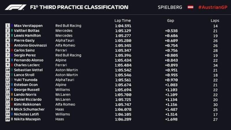 Fuori dalla top ten Yuki Tsunoda 12° che ha ripetuto l'ottimo giro fatto nel primo tentativo, ancora lontano da Alonso Esteban Ocon 13°, alle sue spalle Geroge Russell 14°, in difficoltà la McLaren con Lando Norris 15° e Daniel Ricciardo 16°. Completano la classifica delle Fp3 Kimi Raikkonen, Mick Schumacher, Nicholas Latifi e Nikita Mazepin.