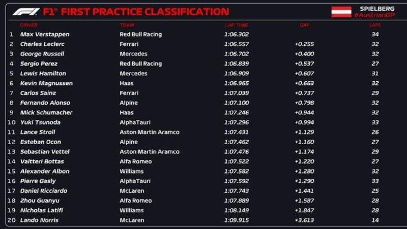 Miglior prestazione di Max Verstappen nella prima sessione di prove libere del Gran Premio dell'Austria 2022 di Formula 1. 1.06.302 è il crono che ha permesso all'olandese di precedere Charles Leclerc, e George Russell. Non hanno iniziato il week end come i loro compagni di squadra Sergio Perez quarto, Lewis Hamilton quinto, e Carlos Sainz soltanto settimo e lontano dai livelli di Silverstone.