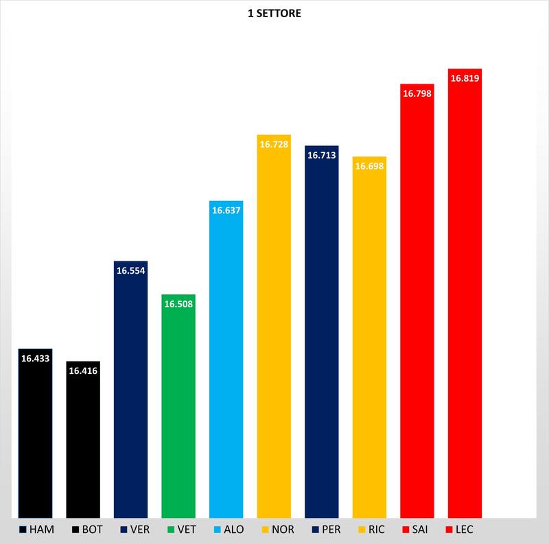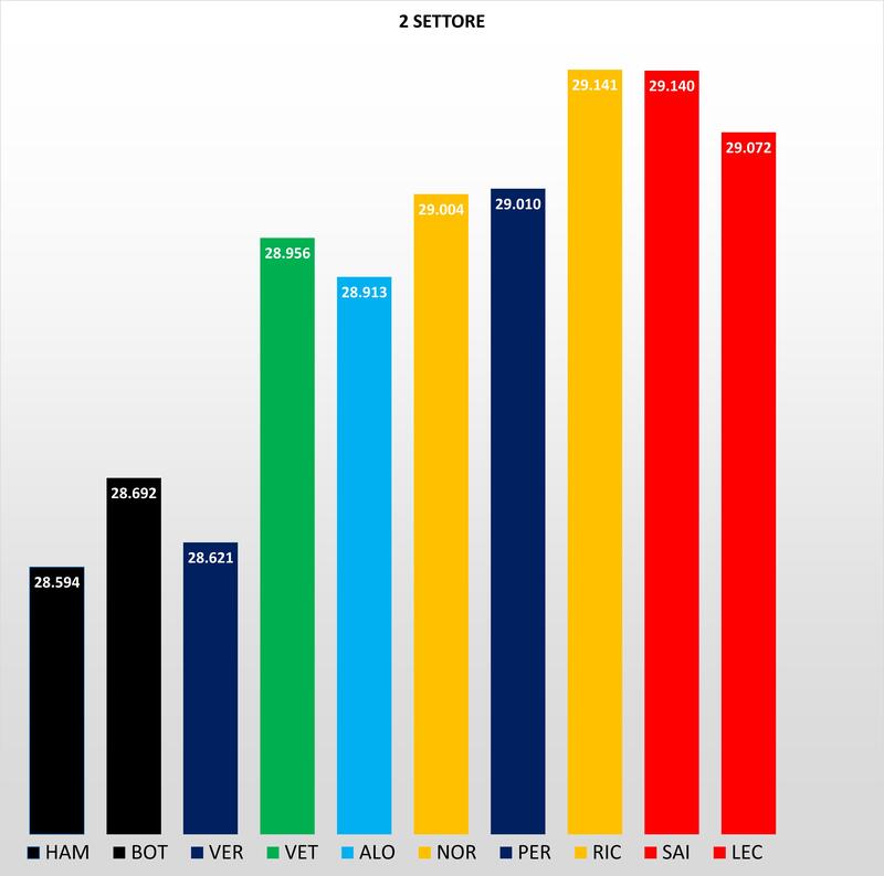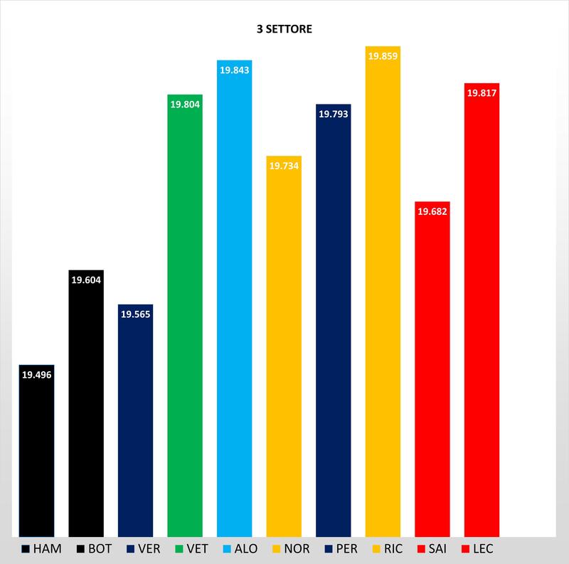 Nella parte centrale come la scorsa settimana Red Bull e Mercedes si equivalgono con Hamilton, Bottas e Verstappen che fanno lo stesso intermedio. Perez ribadisce le sue difficoltà nel giro secco rispetto a Verstappen facendo un T2 peggiore di Vettel e Alonso, sullo stesso intermedio del messicano le McLaren e Ferrari.