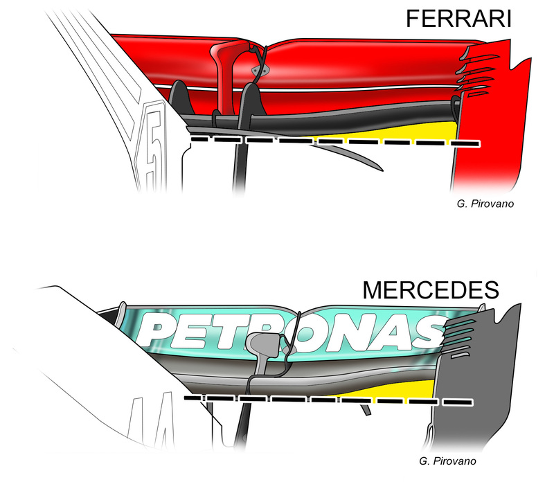 La Ferrari aveva già testato questa soluzione tecnica in Cina, ma in gara il team aveva deciso di sfruttare quella classica, dalla forma lineare. Viste le caratteristiche della pista, è molto probabile che la struttura a cucchiaio venga adottata anche domenica. Mercedes ha scelto un'ala della stessa tipologia, pensata per essere più veloce sul dritto.