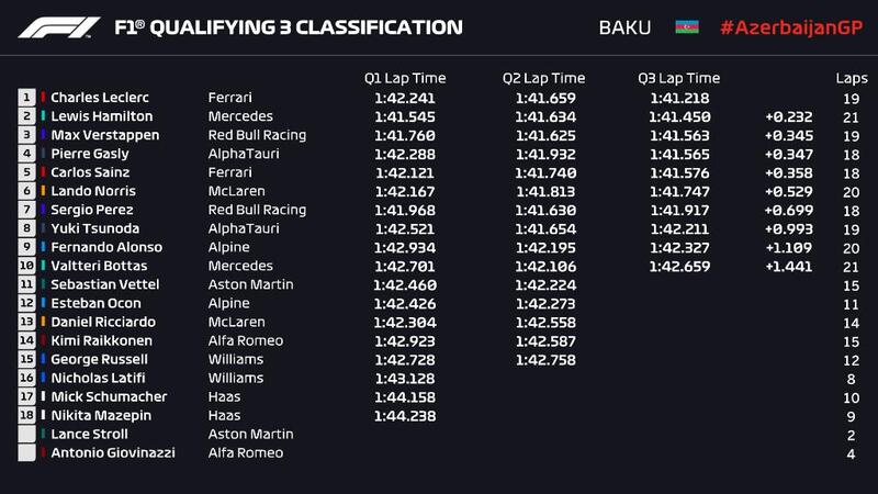 Il monegasco è riuscito a imporsi nelle qualifiche di Baku, facendo una magia nel primo tentativo con il record nel secondo settore e sfruttando la scia di Lewis Hamilton nel T3, ha riscattato l'errore di Monaco. Leclerc anche grazie alle bandiere rosse ad un minuto dalla fine della Q3, ha vinto per due decimi il duello con Hamilton che ha ottenuto una prima fila difficile da pronosticare, dopo le FP1 e FP2.