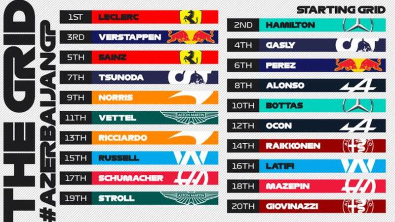 Quinto Carlos Sainz della Ferrari, davanti a Sergio Perez della Red Bull. Partirà dalla settima casella Yuki Tsunoda dell‘Alpha Tauri, in quarta fila insieme a Fernando Alonso dell’Alpine. Chiudono la top ten Lando Norris penalizzato di tre posizioni per non aver rispettato la bandiera rossa in qualifica, ed un deludente Valtteri Bottas.