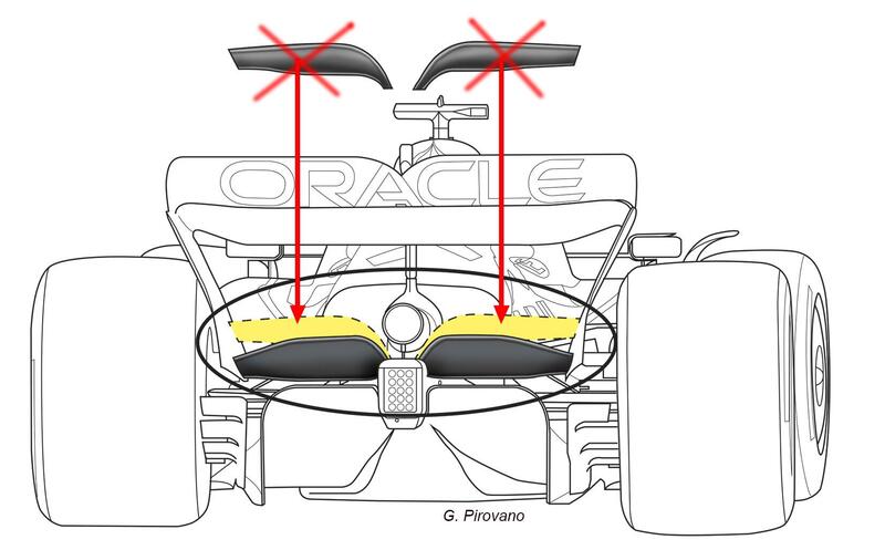 La Red Bull invece ha eliminato un flap dell’ala posteriore nella zona in basso. Le vetture di quest'anno prevedono un doppio flap anche nella zona inferiore dell'ala posteriore (priva invece nel 2021). Per ottenere maggiori velocità di punta la Red Bull ha escogitato questa nuova soluzione che non si era mai vista nei gran premi precedenti. Mantiene il flap posto più in basso mentre quello al di sopra più avanzato è stato tolto.