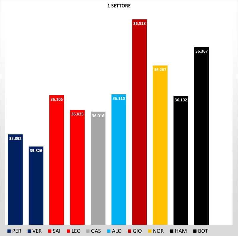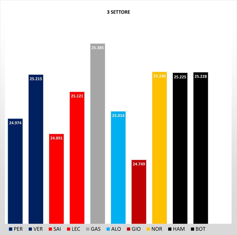 Nel terzo settore a decidere le posizioni sono state le scie, che saranno fondamentali anche nelle qualifiche. Perez e Sainz trovando macchine davanti a loro sul rettilineo, guadagnano due decimi a Verstappen e Leclerc, conquistano il 1 e 3 tempo. Mercedes lente anche nell'ultima parte di pista con Hamilton e Bottas che fanno segnare lo stesso intermedio di Norris.