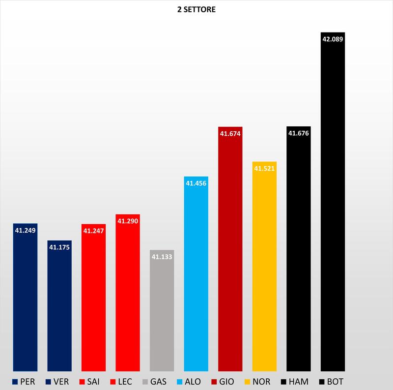 Partiamo con l'analisi della simulazione qualifica dal primo settore, dove la Red Bull fa la differenza con Verstappen che transita in vantaggio di 66 millesimi su Perez. Perdono tre decimi Sainz a Leclerc che nel secondo tentativo aveva fatto il record nel T1 prima di andare a muro. Subito in difficoltà a mandare in temperatura le gomme la Mercedes, in un tratto di pista sulla carta favorevole alla W12.