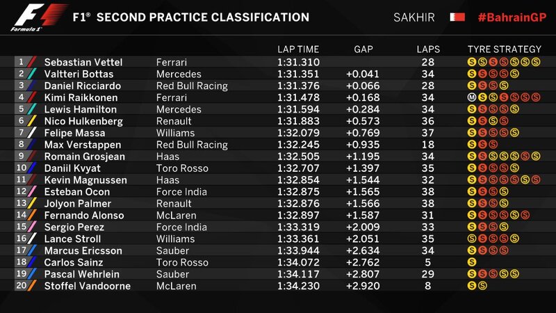 Delle tre sessioni di prove libere, solo le FP2 vengono disputate nelle stesse condizioni di qualifiche e gara, cioè in notturna: fondamentale, dunque, per i team raccogliere dati indicativi in termini di passo gara e giro secco in questi 90 minuti. Ad emergere in queste condizioni è stato Sebastian Vettel, autore del miglior tempo nel tardo pomeriggio di Sakhir.