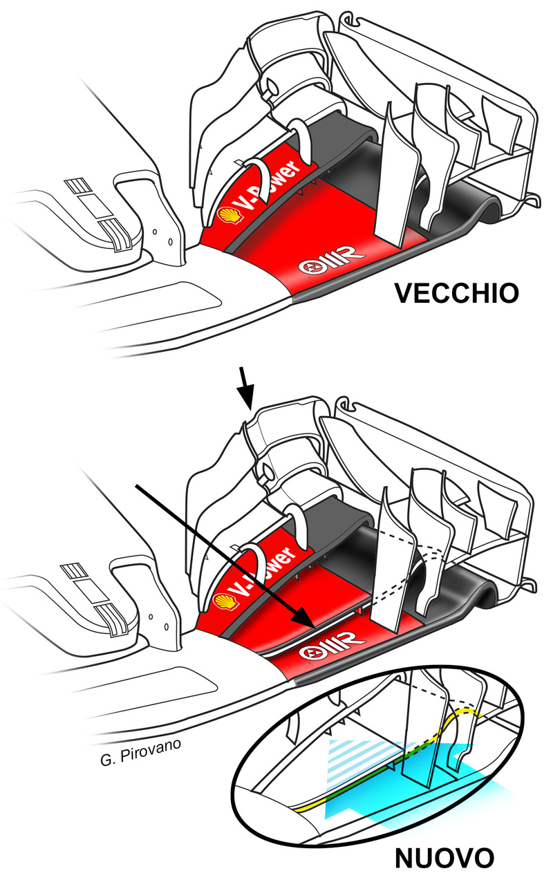 La novità principale di questo aggiornamento dell'ala anteriore della SF70H è un inedito slot di soffiaggio. Una nuova feritoia, questa, pensata per incanalare aria sotto l’ala anteriore.