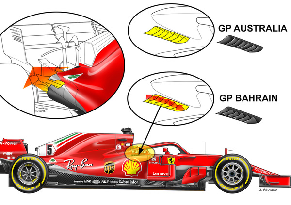 La Ferrari, invece, adotta pance al posteriore con aperture molto più generose e grandi. Come in Australia la zona finale vanta aperture più ampie in altezza rispetto alla versione usata nei test pre-stagione. Le aperture sui lati esterni dell'abitacolo, invece, sono state modificate: la versione portata in Bahrain presenta meno elementi, ma le fessure sono più alte e grandi e non a livello della carrozzeria.