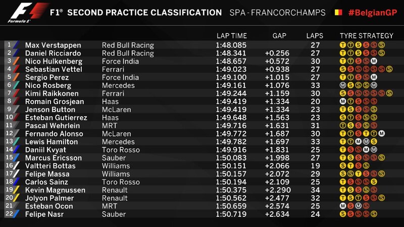 Miglior prestazione per Max Verstappen nella seconda sessione di prove libere a Spa-Francorchamps, in Belgio: 1'48"085 è il crono colto dall'olandese della Red Bull, che ha preceduto il compagno di squadra, Daniel Ricciardo, per 256 millesimi. Verstappen ha battuto di 263 millesimi il miglior tempo delle FP1, fatto registrare dall'alfiere della Mercedes, Nico Rosberg, che in quel giro montava l'halo, testato oggi anche da Hulkenberg, Sainz e Ricciardo. La sessione del mattino è stata caratterizzata dall'ennesimo 1-2 della scuderia di Brackley, grazie al secondo posto di Lewis Hamilton. Nel pomeriggio i due piloti delle Frecce d'Argento si sono dedicati ai long run, lasciando spazio alla concorrenza. Rosberg, sesto, ha effettuato run con la soft.