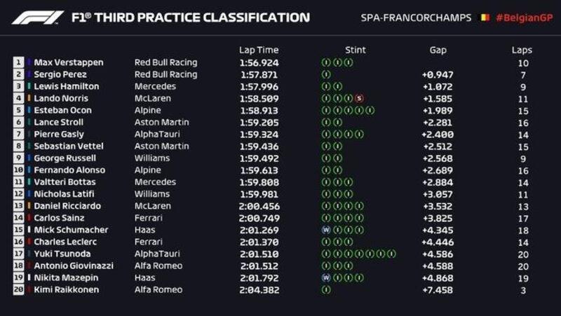 In grande difficoltà le Ferrari, con Carlos Sainz 14° e Charles Leclerc 16° che come nelle FP2 si sono lamentati dell'assetto della macchina, lanciando un grande campanello d'allarme in vista delle prove ufficiali. A sandwich fra le due rosse Mick Schumacher che ha portato la Haas in 15° posizione. Chiudono la classifica della terza sessione del Gran Premio del Belgio, Yuki Tsunoda, Antonio Giovinazzi, Nikita Mazepin e Kimi Raikkonen.