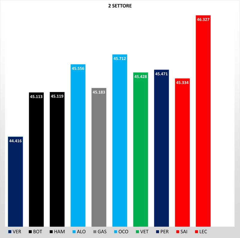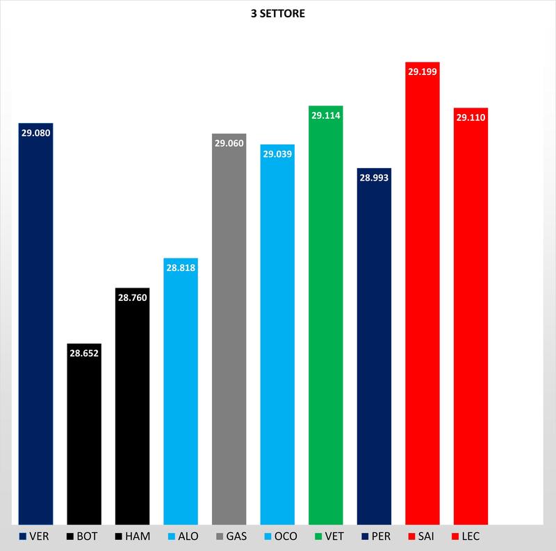 La situazione si ribalta nella parte centrale, con Verstappen che infligge sette decimi a Bottas e Hamilton. Se le Alpine nel T2 non si ripetono e Perez prende un secondo da Verstappen, questo settore è la miglior notizia per la Ferrari con Sainz a soltanto due decimi dalle Mercedes, più veloce di un secondo di Leclerc autore di un brutto 1° tentativo.