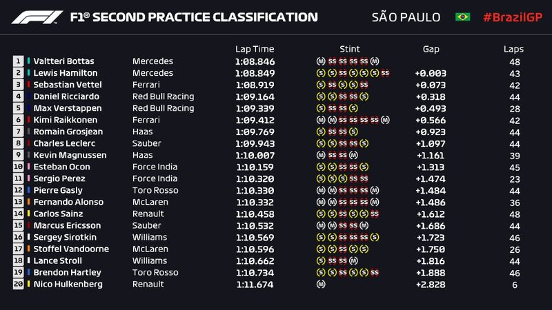 Miglior prestazione per Valtteri Bottas nella seconda sessione di prove libere del Gran Premio del Brasile, penultima prova del mondiale 2018 di Formula 1. 1'08"846 è il crono colto dal pilota della Mercedes. Bottas ha preceduto per soli tre millesimi Lewis Hamilton, suo compagno di squadra, e Sebastian Vettel, della Ferrari. Seguono i due piloti della Red Bull, Daniel Ricciardo e Max Verstappen.