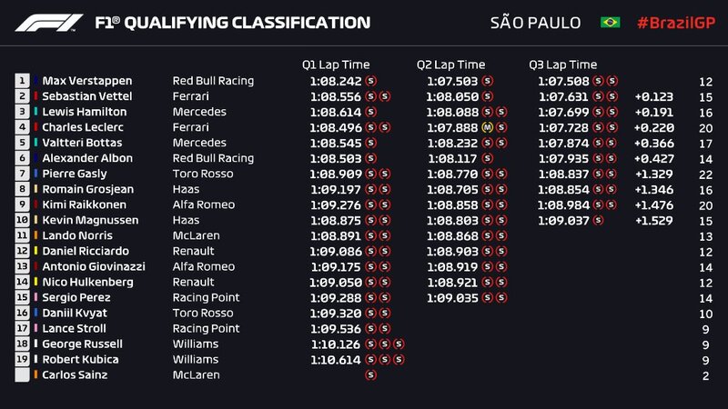 Nelle qualifiche di Interlagos ad imporsi è stato Max Verstappen: sarà il pilota della Red Bull a scattare davanti a tutti nel Gran Premio del Brasile, penultima prova del mondiale 2019 di Formula 1. 1’07”508 è il crono colto dall’olandese, al secondo acuto al sabato in carriera. Verstappen ha preceduto Sebastian Vettel, della Ferrari, e Lewis Hamilton, in forza alla Mercedes. Charles Leclerc ha colto il quarto tempo, ma partirà molto più indietro: al monegasco della Ferrari è stata comminata una penalità di dieci posizioni in griglia per la sostituzione dell’unità endotermica della power unit della sua SF90.
