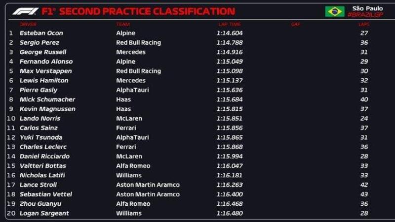 Miglior prestazione di Esteban Ocon nella seconda sessione di prove libere del Gran Premio del Brasile 2022 di Formula 1. Il francese ha preceduto Sergio Perez, George Russell ed il compagno di squadra Fernando Alonso. Alle loro spalle Max Verstappen che come Lewis Hamilton sesto, Carlos Sainz undicesimo e Charles Leclerc tredicesimo, non si sono concentrati sul giro secco ma sul passo della Sprint e gara.