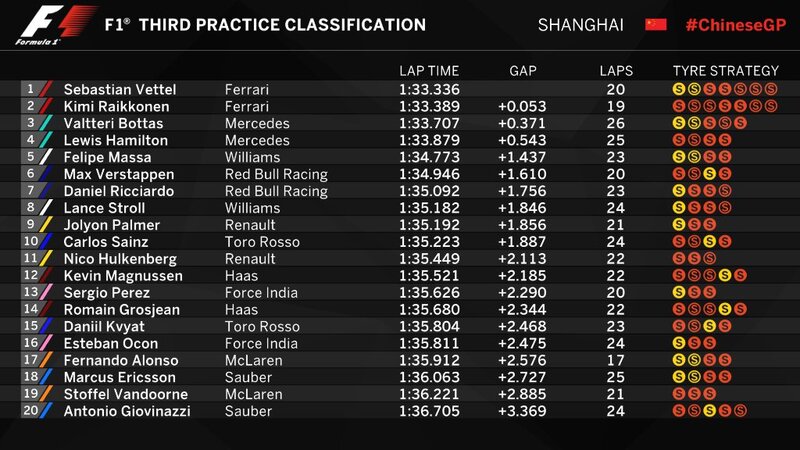 Ferrari davanti a tutti nella terza sessione di prove libere del Gran Premio di Cina: a cogliere il miglior tempo, 1'33"336, è stato Sebastian Vettel, sugli scudi in Australia. Il quattro volte campione del mondo di Formula 1 ha staccato di soli 50 millesimi il suo compagno di squadra, Kimi Raikkonen, che sembra mostrare una forma migliore rispetto a quanto visto a Melbourne, nonostante si sia lamentato del bilanciamento della sua SF70H.