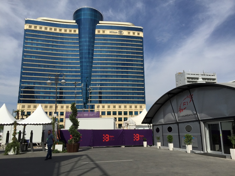 Il cielo è blu a Baku ma il paddock è grigio. Scelta voluta dalla FOM perché grigie sono le divise degli uomini in giro, grigio è il colore dell’ufficio di Bernie e grigio è anche il colore che hanno passato sull’asfalto davanti al palazzo governativo di Baku dove è sorto il paddock F.1. Prima di installare le costruzioni rimovibili (riciclate da altri GP…) si è provveduto a riverniciare tutto! Ma l’opera di perfezionismo non finisce qui, perché per far passare i cavi dei team, TV e altro ancora, sono stati invasi i prati davanti al palazzo, creando non poca confusione. Ebbene anche qui si è provveduto a installare dell’erba sintetica a coprire il tutto. Quindi erba sotto, cavi sopra e pannelli finti sopra, a prima vista sembrava tutto regolare, poi ci guardi da vicino…