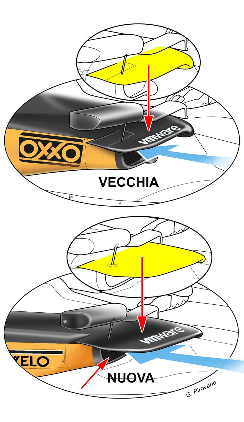 Ad aver rischiato è stata la McLaren che ha portato sulla vettura di Lando Norris un sostanzioso pacchetto di aggiornamenti, mentre su Oscar Piastri solamente il 50% in attesa del restante che dovrebbe essere pronto per Imola. La MCL38 è stata rivista in molte zone come l’ala anteriore, le bocche dei radiatori, il cofano motore e cover sulle sospensioni anteriori e posteriori. In particolare, ci soffermiamo sulle nuove bocche di ingresso aria ai radiatori, che adesso si avvicinano al concetto usato da Red Bull. Il labbro superiore che divide i flussi aria sopra e sotto le pance è stato aumentato di volume, più lungo e grande. Questo gli ha permesso un maggior flusso di aria verso il fondo della vettura; di conseguenza sono state rimpicciolite le bocche aria ai radiatori che restano ancora squadrate e verticali. Le novità tecniche portate dai campioni del mondo di Milton Keynes sulla RB20, ultima monoposto progettata da Adrian Newey, hanno sorpreso tutti i team e in molti seguiranno adesso questo design che vedremo anche sulla Ferrari. Questi aggiornamenti hanno evidenziato una McLaren molto forte nelle qualifiche Shootout, in particolare nelle prime due sessioni con gomme medie. Montate poi le soft, le prestazioni di Lando Norris ed Oscar Piastri sono crollate. Il britannico partirà, infatti, solamente nono nonostante avesse segnato un tempo nettamente inferiore a quello della pole di Verstappen nel SQ2; meglio l’australiano che scatterà sesto.