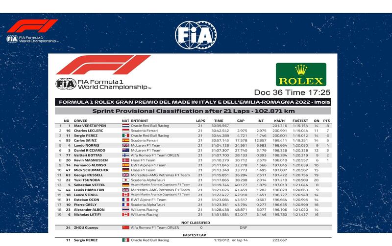 Perez sale sul gradino più basso del podio, davanti a Sainz che recupera sei posizioni rispetto alle qualifiche, a Norris e Ricciardo. Settimo Valtteri Bottas che insieme a Kevin Magnussen ottavo ha superato nel finale un Fernando Alonso nono sottotono. Grande prestazione di Mick Schumacher che chiude la top ten, precedendo la prima delle Mercedes di George Russell che non si è confermato sui livelli delle FP2. Dodicesimo Yuki Tsunoda seguito da Sebastian Vettel crollato nel finale, ed un anonimo Lewis Hamilton, e Lance Stroll. Chiudono la classifica della Sprint race Esteban Ocon, Pierre Gasly, le Williams di Alexander Albon e Nicholas Latifi.