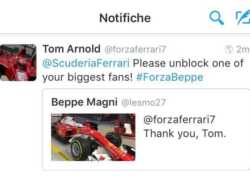Dopo due anni di delusioni (tre considerando la vecchia gestione) capita ai tifosi di interagire con la Ferrari chiedendo lumi. Ebbene, il nuovo corso social di Maranello prevede che non si possano fare critiche, tanto che uno dei tifosi storici della rossa è stato bloccato su twitter. Beppe è un padre di famiglia che segue la Ferrari da quando era ragazzino, si veste di rosso coi colori ufficiali, fa sacrifici per comprare i biglietti per i GP e si paga i viaggi e dorme dove capita pur di stare vicino alla sua squadra. Fa parte di quel gruppo di tifosi che apre il cuore rosso ad ogni GP e partecipa con ansia alle vicende della sua squadra. Ebbene, a Baku chi gestisce il social Ferrari lo ha bloccato perché non ha voluto dare spiegazioni a una domanda del tifoso Beppe. Subito è scattata la solidarietà degli altri tifosi e qualche sito ha ripreso la storia.