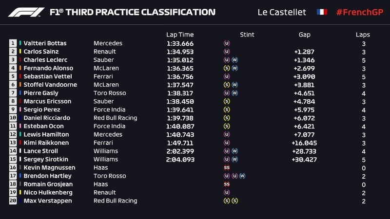 Miglior tempo per Valtteri Bottas nella terza sessione di prove libere del Gran Premio di Francia, ottava prova del mondiale 2018 di Formula 1. 1'33"166 è il crono colto dal pilota della Mercedes. Bottas ha preceduto Carlos Sainz, della Renault, e Charles Leclerc, in forza alla Sauber. Come si evince da questa classifica quantomeno curiosa, non si tratta di tempi indicativi: a farla da padrone è stato il maltempo.
