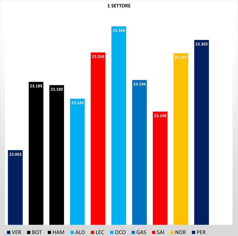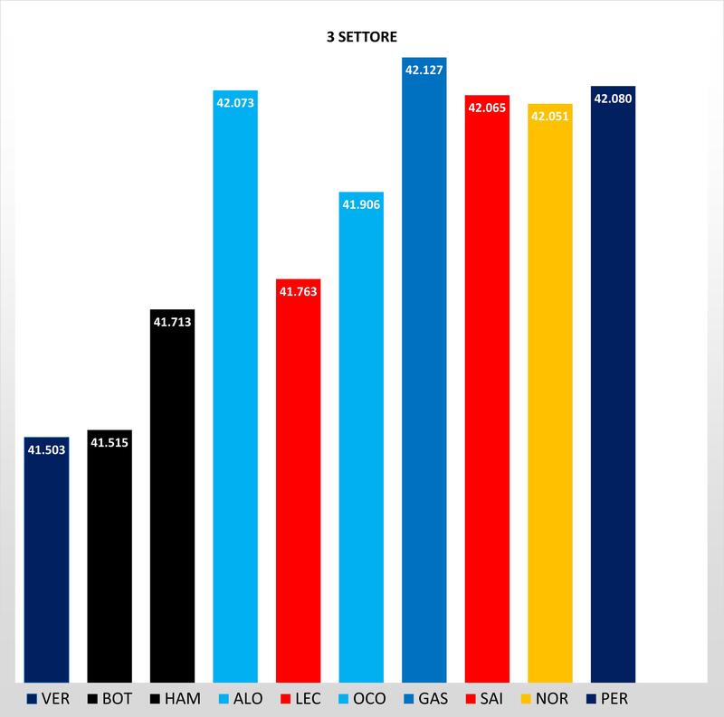 Nel terzo settore si decide il duello Verstappen-Bottas, con l'olandese che per soli 8 millesimi fa la miglior prestazione. Hamilton perde due decimi dal rivale e compagno di squadra, mentre Alonso che ha chiesto troppo alle soft nei precedenti settori, accusa un distacco di mezzo secondo. Nell'ultima parte di pista Leclerc dimostra che se la Ferrari aggiusterà il T2 può giocarsi la seconda fila in qualifica, mentre Sainz è più lento di tre decimi dal compagno di squadra, e Perez è ancora lontano dai livelli di Baku.