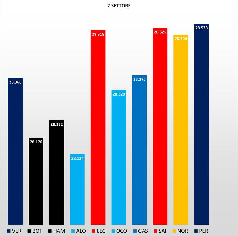 Partiamo con l'analisi della simulazione qualifica dal primo settore, dove Verstappen sfruttando un tratto di pista favorevole alle caratteristiche della RB16 B, transita in vantaggio di un decimo su Bottas e Hamilton. Alonso conferma come nel primo tentativo che l'Alpine può essere protagonista nel Gp di casa facendo un intermedio migliore delle Mercedes. Fin dal T1 si vede un'altra Ferrari rispetto alle FP1, con Sainz che parte forte, mentre Leclerc perde un decimo dal compagno di squadra.