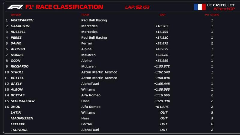 L'ultima emozione della gara è il ritiro di Zhou, che fa applicare la procedura della virtual safety car. Alla ripartenza Russell supera Perez e conquista il gradino più basso del podio, mentre Sainz sorpassando Ocon, Ricciardo, Norris e Alonso risale fino in quinta posizione. Negli ultimi giri Verstappen amministra, e va a festeggiare la seconda vittoria consecutiva nel Gran Premio di Francia, con la quale mette le mani sul titolo. Alle sue spalle Hamilton che ottiene il miglior piazzamento stagionale, con Perez che tenta di riprendersi la terza posizione attaccando nell'ultima curva Russell, che difende il podio. Sainz sfoga la rabbia per la decisione della Ferrari di non fargli provare di andare fino in fondo, con il giro veloce e transitando sotto la bandiera a scacchi quinto. Dietro allo spagnolo il connazionale Alonso, che precede Norris ed il compagno di squadra Ocon, con Ricciardo e Stroll che resiste a Vettel i quali completano la top ten. Fuori dalla zona punti anche Pierre Gasly, seguito da Alexander Albon, Valtteri Bottas e Mick Schumacher.