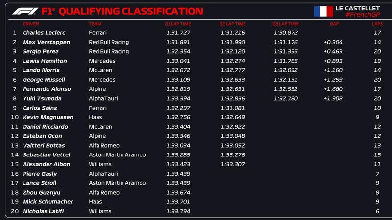Nelle qualifiche del Paul Ricard ad imporsi è la Ferrari: sarà Charles Leclerc a scattare davanti a tutti nel Gran Premio di Francia 2022 di Formula 1, dodicesima prova del mondiale 2022 di Formula 1. 1.30.872 è il crono che ha permesso al monegasco di tornare in pole e conquistare grazie all'aiuto di Carlos Sainz la sedicesima partenza dal palo della sua carriera, raggiungendo Max Verstappen. L'olandese si è dovuto accontentare di completare la prima fila, con Sergio Perez che ha preceduto Lewis Hamilton, mentre Lando Norris piazza la McLaren in quinta posizione davanti a George Russell. Nono Carlos Sainz che è sceso in pista nella Q3 solo per concedere la scia a Leclerc.