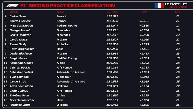 Miglior prestazione di Carlos Sainz nella seconda sessione di prove libere del Gran Premio di Francia 2022 di Formula 1. 1.32.527 è il crono colto dallo spagnolo che ha preceduto il compagno di squadra Charles Leclerc il quale completa l'uno-due della Ferrari. All'inseguimento delle Rosse Max Verstappen terzo, davanti alle Mercedes di George Russell e Lewis Hamilton, e a Lando Norris. In difficoltà come nelle FP1, Sergio Perez decimo che si è inserito fra Daniel Ricciardo e Fernando Alonso.