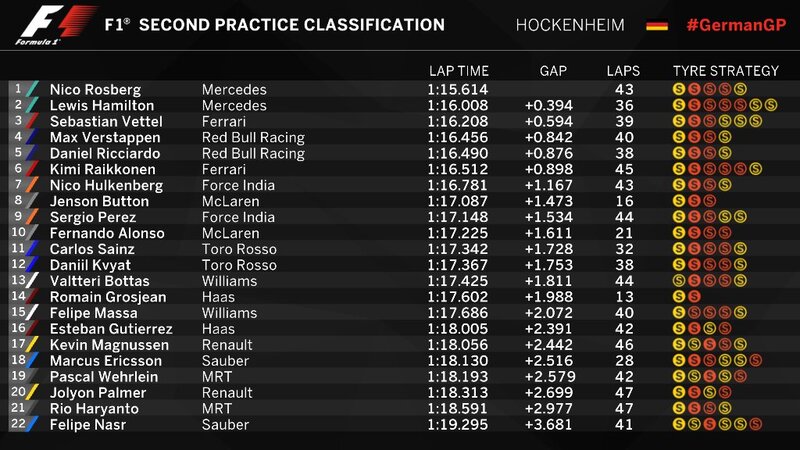 A separare i due alfieri della Ferrari troviamo i due piloti della Red Bull, Max Verstappen e Daniel Ricciardo: solo 30 millesimi hanno separato Verstappen e Ricciardo, protagonisti di un'avvincente sfida all'interno del team di Milton Keynes. Settima posizione per un altro idolo di casa, Nico Hulkenberg; il pilota della Force India nella mattinata di oggi si è dedicato esclusivamente a long run con la mescola più dura scelta da Pirelli per Hockenheim, la media. Anche il suo compagno di squadra, Sergio Perez, nono nel pomeriggio, ha svolto lo stesso lavoro nelle FP1.