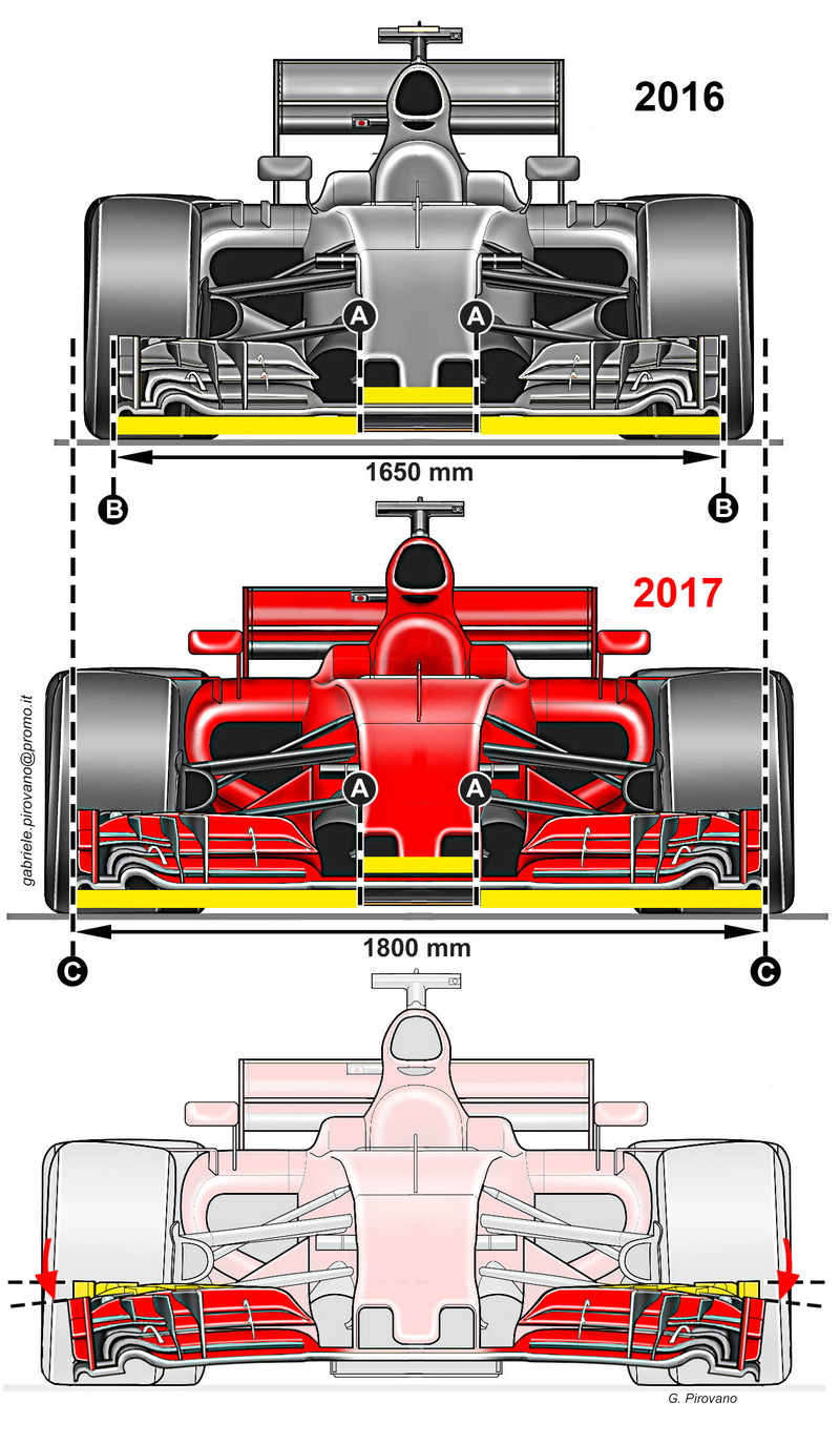 La larghezza del muso, invece, rimane invariata e quindi i piloni che sorreggono l’ala saranno uguali e nella stessa posizione (vedi A). Aumenta invece il volume totale in larghezza della nuova ala (1650 mm per il 2016 – vedi B) (1800 mm per il 2017 –vedi C).