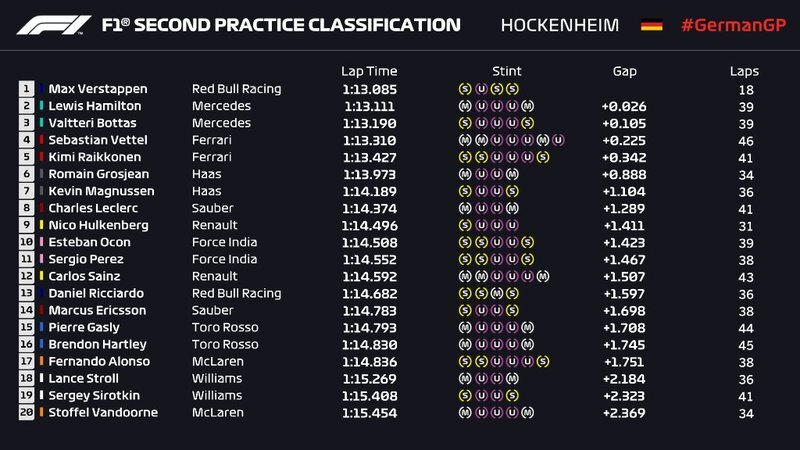 Miglior prestazione per Max Verstappen nella seconda sessione di prove libere del Gran Premio di Germania: 1'13"085 è il crono colto dall'olandese della Red Bull. Verstappen ha preceduto i due piloti della Mercedes, Lewis Hamilton e Valtteri Bottas, staccati di 26 millesimi e un decimo, rispettivamente. Verstappen, però, ha accusato un problema tecnico che l'ha indotto ad interrompere il lavoro in pista per una ventina di minuti. La prima delle Ferrari è quella dell'idolo di casa ad Hockenheim, Sebastian Vettel, quarto; segue il suo compagno di squadra, Kimi Raikkonen.