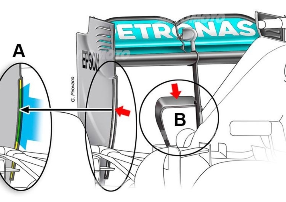 In casa Mercedes sono nuove le paratie laterali (A) con feritoia più alta e lunga sul bordo di entrata. La scuderia di Brackley, inoltre, utilizza l’alettoncino centrale (monkey seat, B) sopra la struttura a protezione urti per generare più carico aerodinamico.