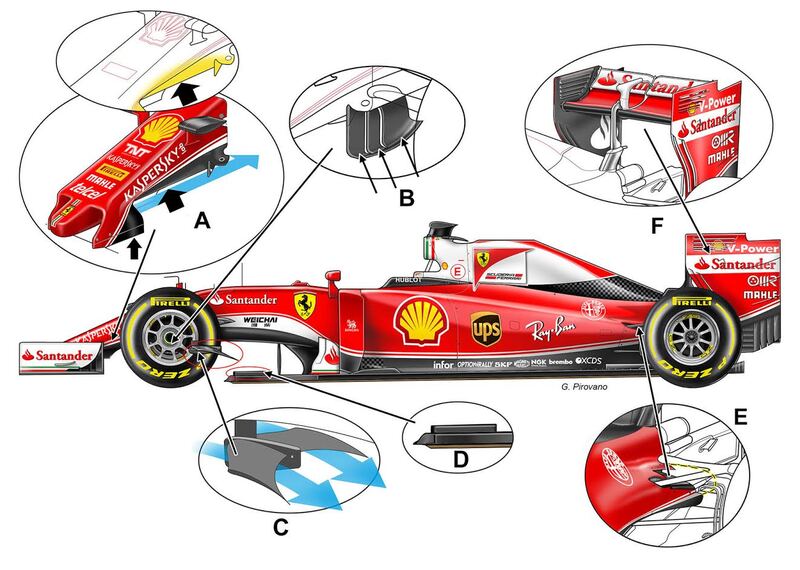Con questa nuova conformazione aerodinamica in Giappone la Ferrari in qualificaè potuta stare davanti alle Red Bull e molto vicina alla Mercedes. Nel disegno sono evidenziate le soluzioni adottate per la gara.