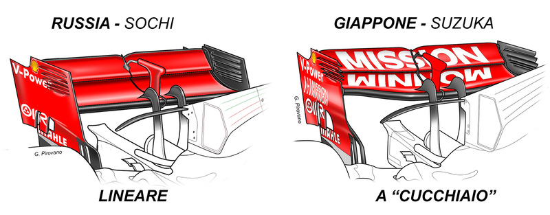 A Suzuka, teatro del Gran Premio di Giappone di Formula 1, la Ferrari ha portato un'ala posteriore a cucchiaio. In Russia le velocità di punta inferiori alla Mercedes erano dovute ad una scelta aerodinamica più carica rispetto a quella del team di Brackley, che utilizzava proprio un'ala posteriore a cucchiaio.