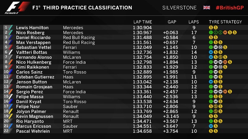 Sono soli 63 millesimi a separare i due piloti della scuderia di Brackley: la seconda posizione è ad appannaggio di Nico Rosberg. Rosberg è reduce da un venerdì difficile: il pilota tedesco, attualmente leader del mondiale, è stato costretto a saltare la seconda sessione di prove libere nel pomeriggio di ieri per via di una perdita d'acqua alla sua W07 Hybrid. Per Rosberg le FP3 sono state fondamentali per recuperare il tempo perso nella giornata di ieri. Terza posizione, invece, per il pilota della Red Bull, Daniel Ricciardo, che ha preceduto il compagno di squadra, Max Verstappen. La RB12 è apparsa decisamente ben bilanciata nelle mani dei due alfieri della Red Bull. Il pacchetto aerodinamico della scuderia di Milton Keynes sembra adattarsi molto bene alle esigenze della pista di Silverstone, specie in entrata di curva.