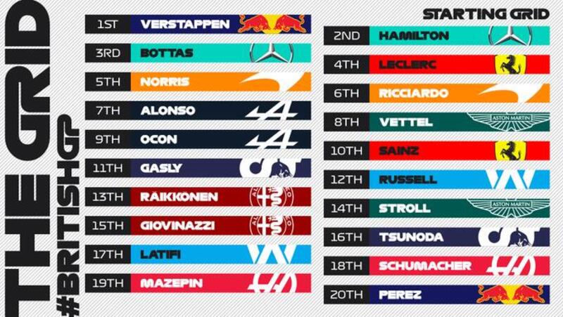 Tredicesimo Kimi Raikkonen dell'Alfa Romeo, seguito da Lance Stroll dell'Aston Martin Antonio Giovinazzi dell'Alfa Romeo e Yuki Tsunoda dell'Alpha Tauri. Completano lo schieramento Nicholas Latifi della Williams, Mick Schumacher e Nikita Mazepin della Haas, Sergio Perez della Red Bull.