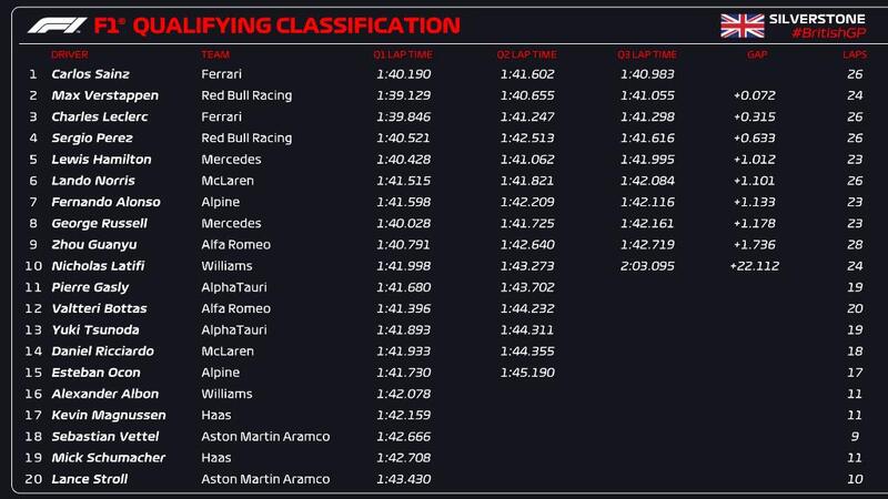 Nelle qualifiche di Silverstone ad imporsi è la Ferrari: sarà Carlos Sainz a partire davanti a tutti nel Gran Premio di Gran Bretagna, decima prova del mondiale 2022 di Formula 1. 1.40.983 è il crono che ha permesso allo spagnolo di conquistare la prima pole position della sua carriera, battendo Max Verstappen. Terzo Charles Leclerc che ha pagato un errore nell'ultimo tentativo, davanti a Sergio Perez, che nel finale con una zampata si è preso la seconda fila. Delusione in casa Mercedes che ha lottato con Red Bull e Ferrari fino agli ultimi minuti, Lewis Hamilton è quinto precedendo Lando Norris, ottavo George Russell alle spalle di Fernando Alonso.