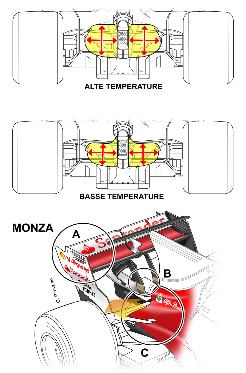 La scuderia di Maranello ha portato una nuova ala posteriore, non più a “cucchiaio” come quella usata a Spa ma con elementi completamente rettilinei (vedi A).