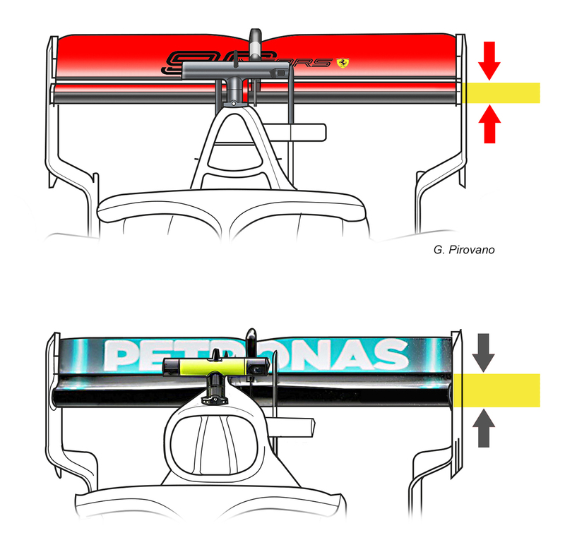 Il flap principale dell'ala posteriore della Ferrari SF90 vista a Monza, completamente rettilineo e molto piccolo, presentava una corda molto ridotta. L'ala posteriore della Mercedes W10, invece, vantava un flap leggermente sollevato al centro, ma una corda maggiore. Grazie a questa soluzione, la Ferrari SF90 nei rettifili raggiungeva velocità di punta elevatissime, pari o leggermente superiori rispetto a quelle fatte registrare dalla Mercedes con il DRS attivo.