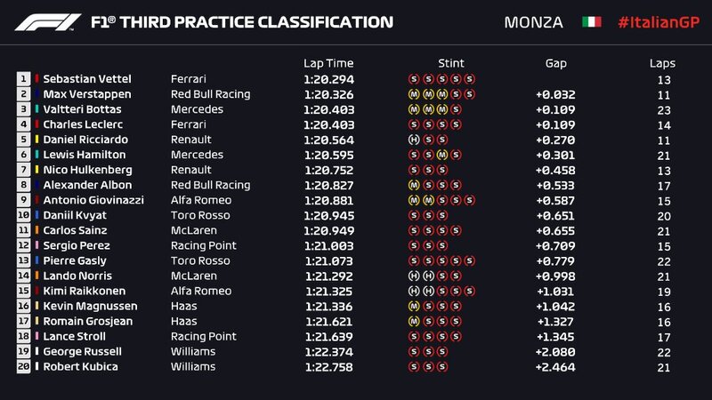 Miglior prestazione per Sebastian Vettel nella terza sessione di prove libere del Gran Premio d'Italia 2019 di Formula 1 a Monza. 1'20"294 è il crono colto dal pilota della Ferrari, che ha preceduto Max Verstappen, in forza alla Red Bull, e il finlandese della Mercedes, Valtteri Bottas. Quarta posizione per Charles Leclerc, al top nelle FP del venerdì; seguono Daniel Ricciardo, della Renault, e il campione del mondo in carica, Lewis Hamilton.