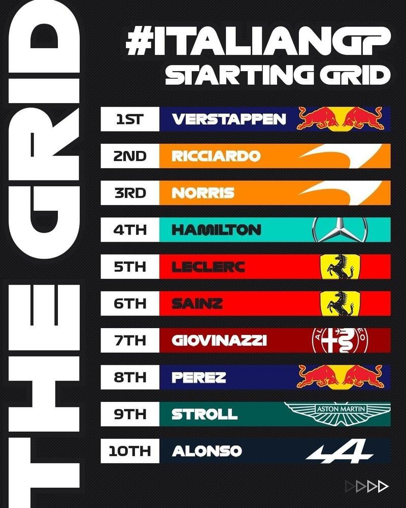 Sarà Max Verstappen a partire dalla pole nel Gran Premio d'Italia 2021 di Formula 1, grazie alla penalità di Valtteri Bottas. Accanto a lui scatterà Daniel Ricciardo della McLaren. Lando Norris occuperà la seconda fila con Lewis Hamilton della Mercedes.