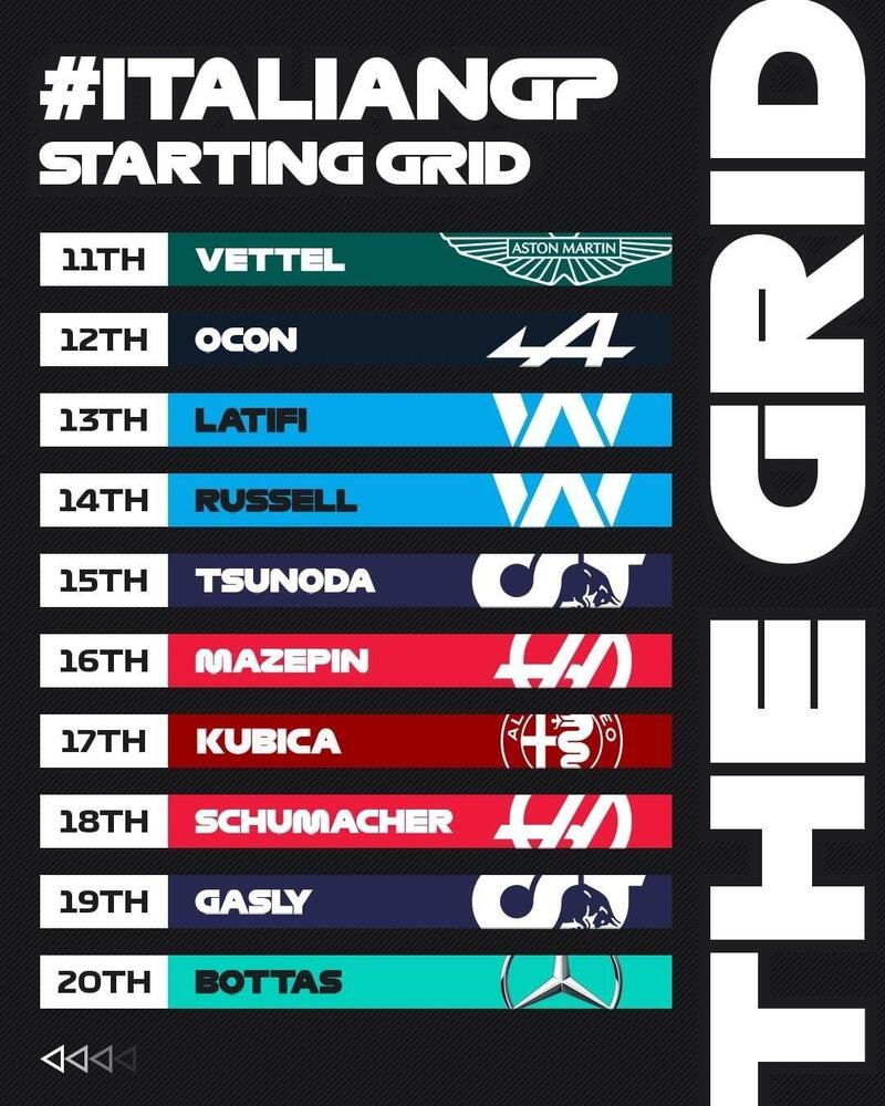Undicesimo Sebastian Vettel dell'Aston Martin, con Esteban Ocon dell'Alpine che scatterà dodicesimo. Tredicesimo Nicholas Latifi della Williams, seguono George Russell, Yuki Tsunoda dell'Alpha Tauri, e Nikita Mazepin della Haas.