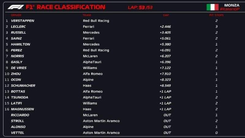 Il ritiro di Ricciardo sembra poter riaprire la gara nel 47° giro, con Verstappen, Leclerc, Russell e Sainz che fanno il pit stop. Invece la difficoltà della safety car, a ricompattare il gruppo fa sì che la corsa non riparta tra i fischi dal pubblico. Verstappen può festeggiare la prima vittoria a Monza, e la quarta consecutiva, davanti ad un furioso Leclerc, Russell, Sainz, Hamilton e Perez. Completano la top Norris, Gasly, De Vries che va a punti alla prima gara in Formula 1, e Zhou. Undicesimo Ocon seguito da Schumacher, un anonimo Bottas, Tsunoda, Latifi e Magnussen.