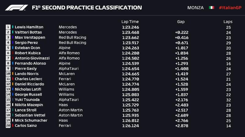 Non hanno cercato il tempo ma si sono concentrati sul passo anche Lance Stroll 17° e Sebastian Vettel 18° che precedono Mick Schumacher 19°. Chiude la classifica della seconda sessione del Gran Premio d'Italia, Carlos Sainz andato a muro all'Ascari come Sabato scorso in Olanda.