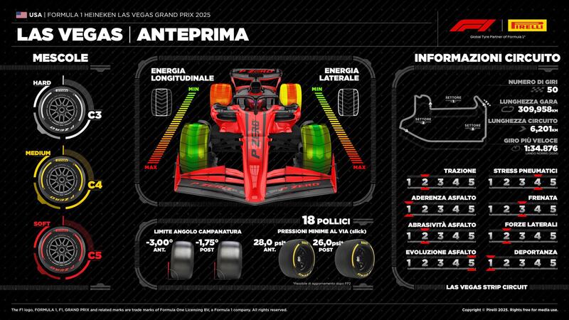 Parlando di gomme, per il terzo anno consecutivo le mescole selezionate per Las Vegas sono C3, C4 e C5. Una delle sfide principali sarà gestire la temperatura degli pneumatici, soprattutto nelle qualifiche. L’anticipazione delle sessioni di pista sarà un aiuto, perché i piloti troveranno condizioni meno rigide e più favorevoli al riscaldamento delle mescole. Sarà comunque cruciale effettuare un giro di preparazione prima di quello lanciato, per portare le gomme nella finestra di utilizzo ottimale.