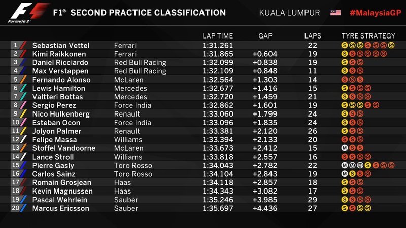 Ferrari al top nella seconda sessione di prove libere del Gran Premio della Malesia: Sebastian Vettel ha colto il miglior tempo, staccando di sei decimi il suo compagno di squadra, Kimi Raikkonen. 1'31"261 è il crono ottenuto dal tedesco della Rossa, detentore del record del maggior numero di vittorie in carriera a Sepang, quattro. Le FP2 sono terminate anzitempo a causa di un incidente che ha visto protagonista Romain Grosjean a 20 minuti dal termine della sessione.
