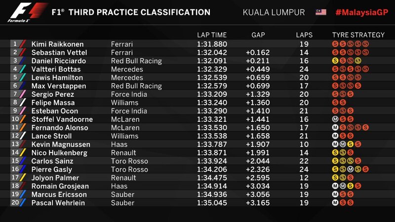 Miglior prestazione per Kimi Raikkonen nella terza sessione di prove libere del Gran Premio della Malesia: 1'31"880 è il crono del finlandese, che si è imposto sul compagno di squadra, Sebastian Vettel, per 162 millesimi. Nel corso delle FP3, Raikkonen ha accusato delle vibrazioni al posteriore; anche Vettel si è lamentato della mancanza di grip. Questo non ha impedito loro di imporsi sulla concorrenza, sebbene con un distacco inferiore rispetto alla giornata di ieri. Reduce dalla Caporetto di Singapore, la Ferrari si è dimostrata competitiva nel venerdì di Sepang, totalizzando una doppietta nelle FP2; la Rossa di Maranello ha replicato il risultato anche oggi. Al termine della sessione, però, Vettel è dovuto rientrare ai box lentamente, non cambiando marcia, per un problema all'elettronica della sua SF70H; i tecnici cambieranno il motore installandone uno nuovo prima delle qualifiche.