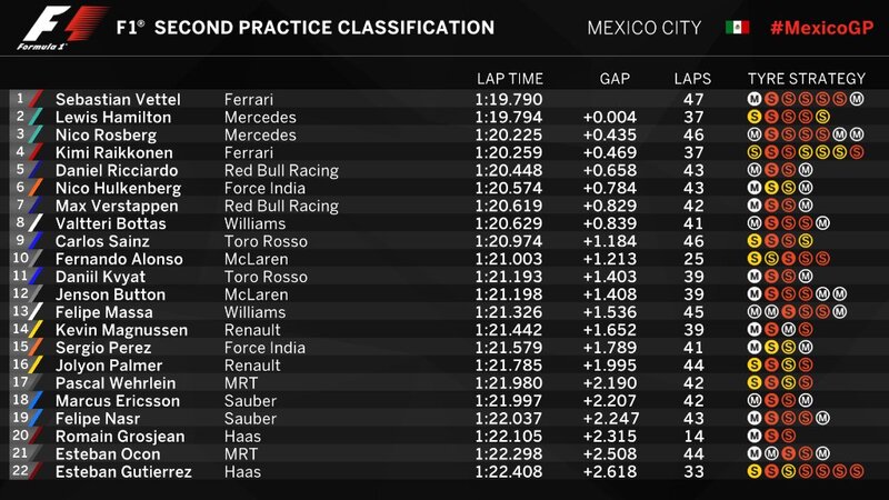La mescola più adatta a questa situazione per i long run sembrerebbe essere la media, in grado di raggiungere la temperatura ottimale di utilizzo più velocemente rispetto ai due compound più teneri scelti da Pirelli per il Messico, le soft e le supersoft, mescola con cui Vettel ha colto il suo miglior tempo. Sono solo 4 i millesimi a separare Vettel dal secondo classificato, il pilota della Mercedes, Lewis Hamilton, sugli scudi nelle FP1; terza posizione per l'attuale leader del campionato piloti, nonché compagno di squadra di Hamilton, Nico Rosberg, staccato di 4 decimi.