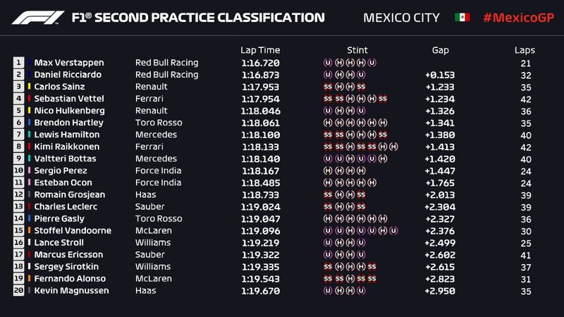 Se le prestazioni della Red Bull stupiscono fino ad un certo punto - il team è sempre stato piuttosto competitivo in Messico: lo scorso anno a vincere qui fu proprio Verstappen - a destare sorpresa sono certamente le performance della Renault, capace di piazzare i propri piloti nelle posizioni alte della classifica nelle FP2. Carlos Sainz è terzo, mentre Nico Hulkenberg quinto. A separarli troviamo Sebastian Vettel, della Ferrari.
